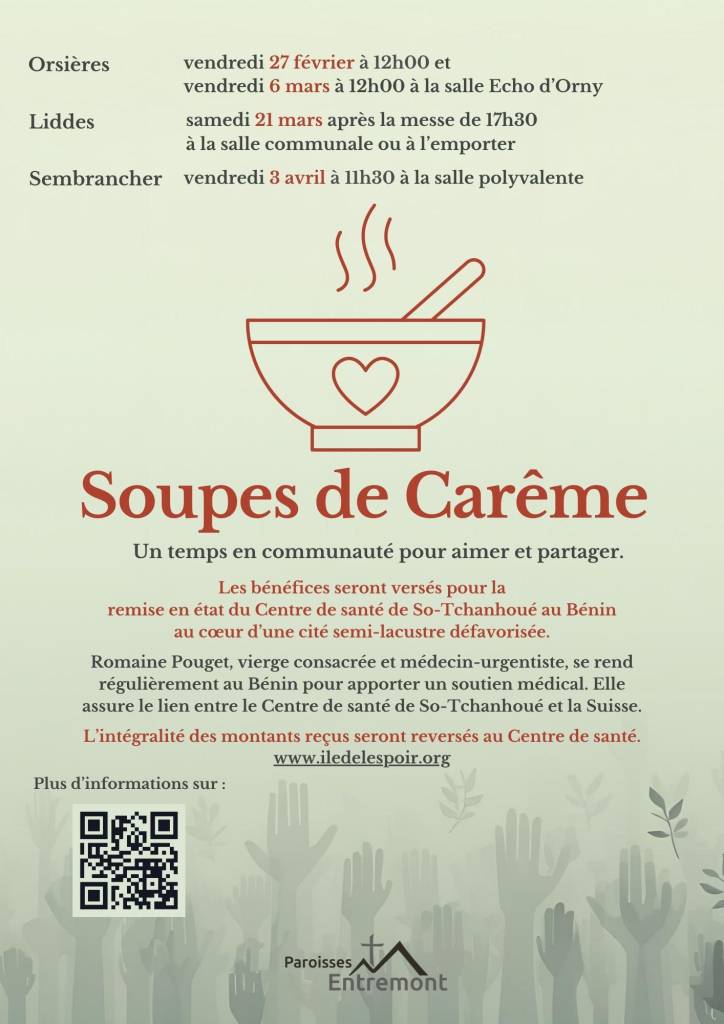 Le secteur des paroisses d’Entremont (Orsières, Sembrancher, Liddes et Bourg-Saint-Pierre) ainsi que l’Hospice du Grand-Saint-Bernard ont versé le bénéfice des soupes de Carême 2026 pour le centre de santé de So-Tchanhoué. C’est un soutien extraordinaire qui permettra de finaliser les travaux de rénovation en cours. Un tout grand merci à tous les bénévoles pour leur engagement au service leurs frères et soeurs béninois.